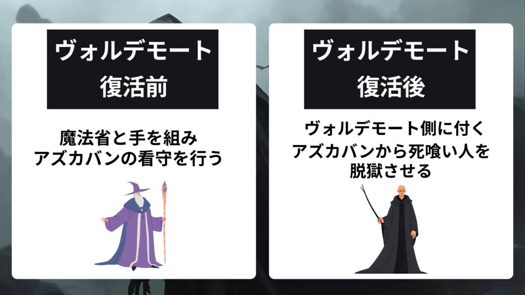 ヴォルデモートが復活するとディメンターが闇の陣営側についたため、アズカバンの監視を放棄しました
