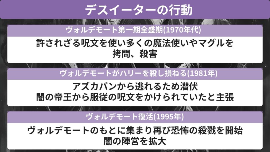 第一次魔法戦争でヴォルデモートが敗れた際には、死喰い人の多くは犯した罪の責任を取らされないようにするため、潜伏するか、服従の呪文に支配されていたと主張、一部の死喰い人はアズカバンで終身刑を言い渡され、闇の帝王の復活を待つ者もいました