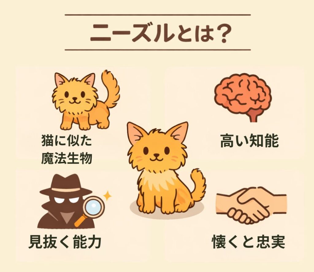 作者JKRは「ハーマイオニーには普通ではない知性を持った猫を持たせることにしたかった」ため、ニーズルの血を半分引く猫にしたそうです
