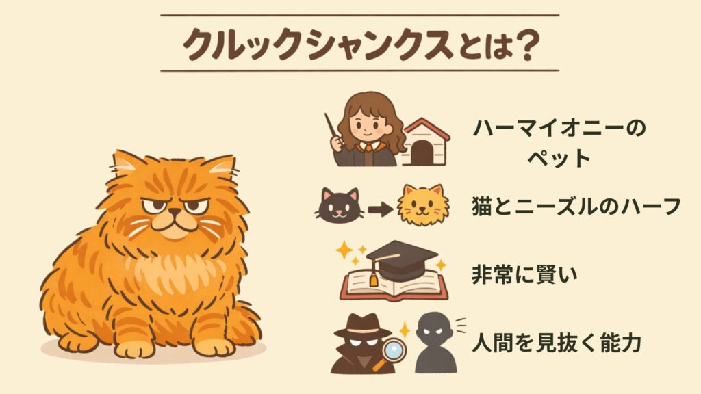 クルックシャンクスはハーマイオニーのペットの猫で、ニーズルの血を引き、真実を見抜く能力があります