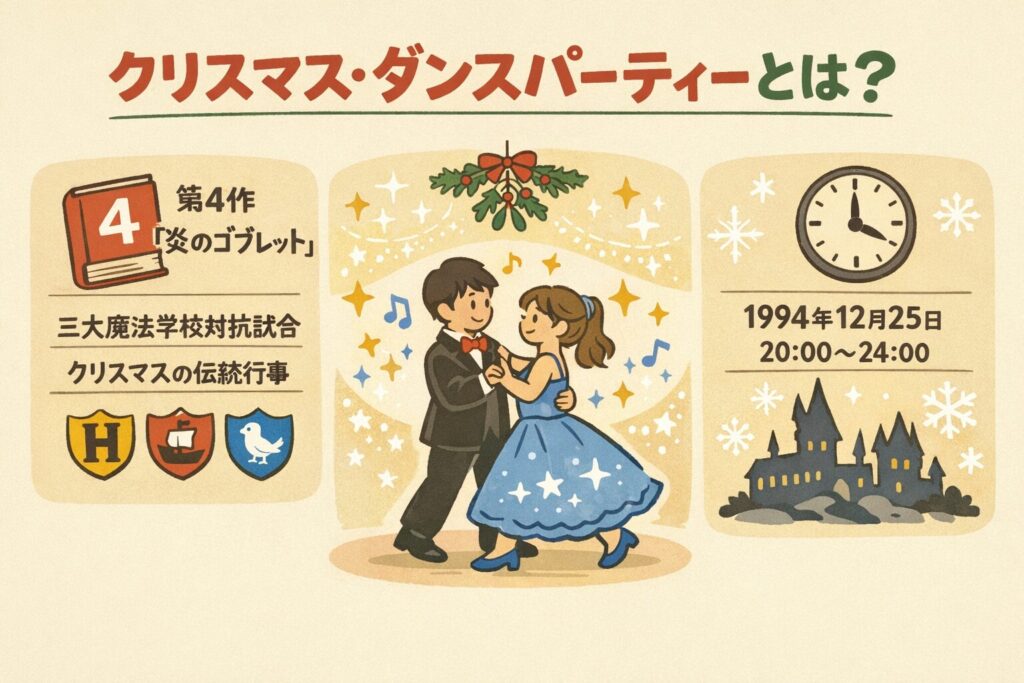 この記事では、ハリー・ポッターのダンスパーティーが登場する作品とシーンの概要から、当日の出来事の流れ、ハリー・ロン・ハーマイオニーそれぞれの心情までを、わかりやすく解説します