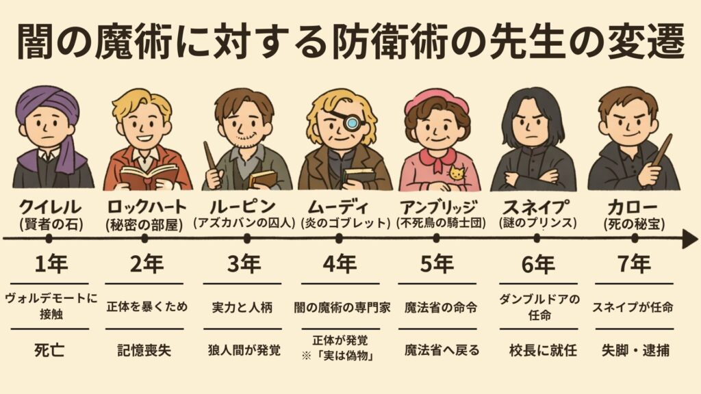 ハリー・ポッターシリーズでは、毎年「闇の魔術に対する防衛術」の先生が変わるのが特徴です