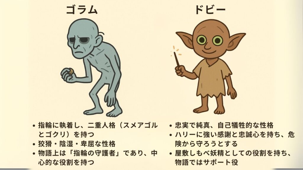 ドビーとゴラムは確かに似た要素を持っていますが、以下のように異なります