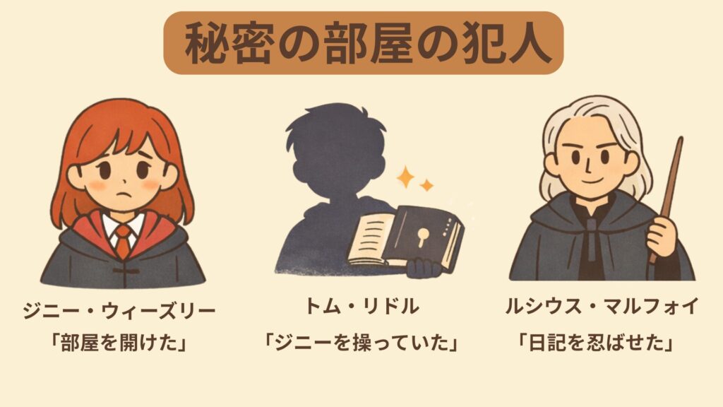 秘密の部屋の犯人は複雑で、複数人が関わっています