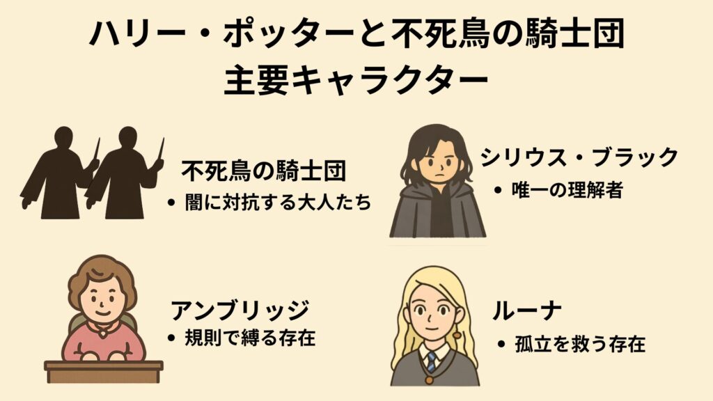 - 主要なキャラクター(シリウス、アンブリッジ、ルーナ)