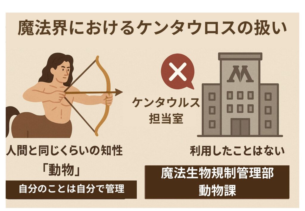 魔法界では、ケンタウロスは人間と同じくらいの知性を持ちながら「動物」に分類されています