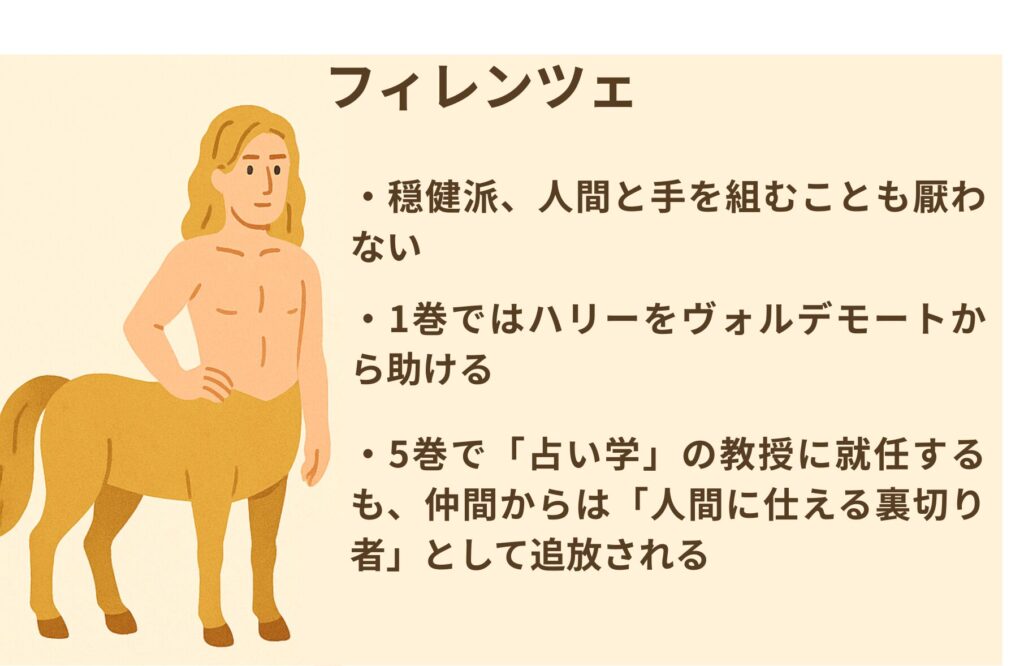 「賢者の石」で初登場したケンタウロスで、ケンタウロスの中では必要とあらば人間と手を組んでも構わないと考える穏健派です