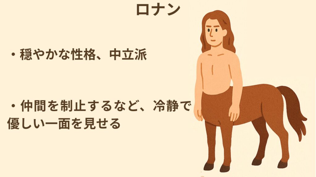 5巻では、アンブリッジを森に連れてきたハリーとハーマイオ ニーに腹を立てたケンタウルスの群れが、二人を攻撃しようとしましたが、 ロナンだけは「この子たちは幼い。我々は仔馬を襲わない」と言い、仲間を制止しました
