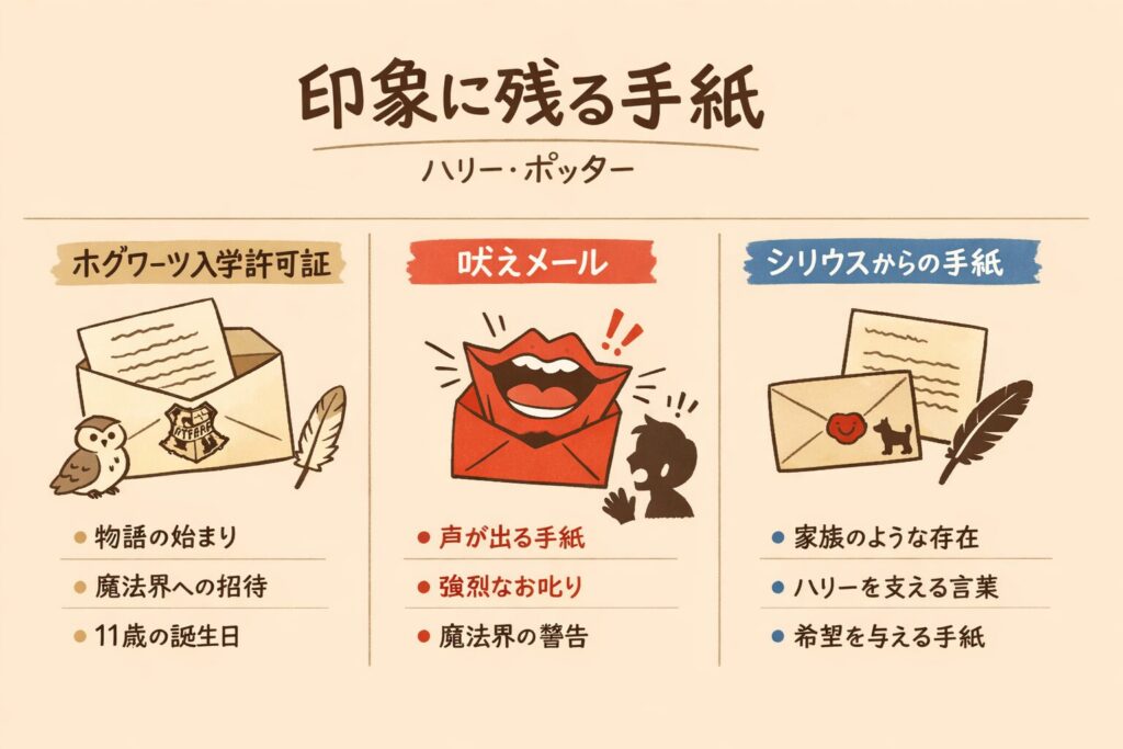 ハリー・ポッターで最も有名な手紙はホグワーツ入学許可証で、物語には他にも印象的な手紙がいくつか登場します