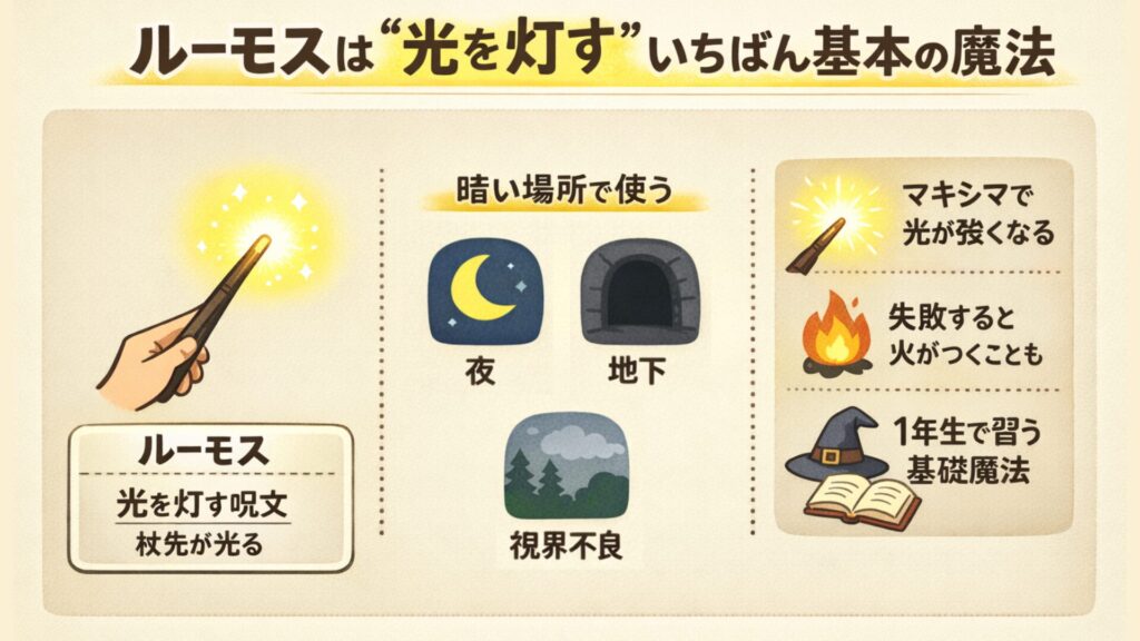 ルーモスは、杖先に光を灯す基本的な呪文です