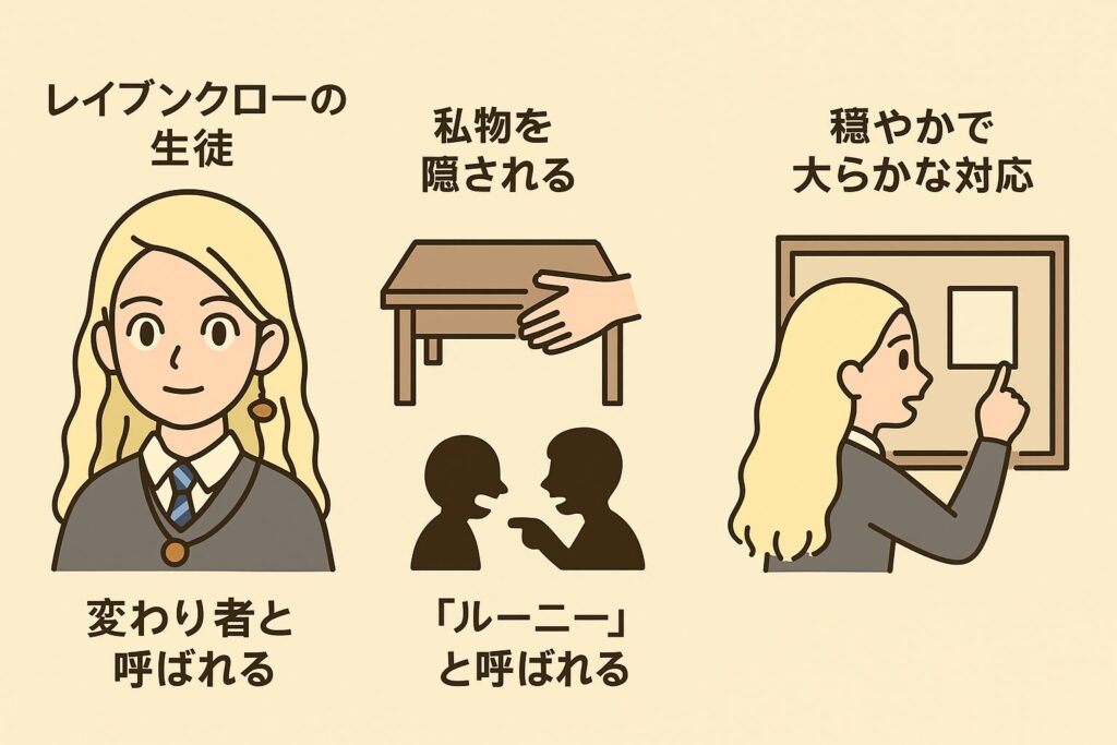 ルーナ・ラブグッドは、一風変わった生徒として、からかわれたり周囲から物を隠されたりといういじめがありました