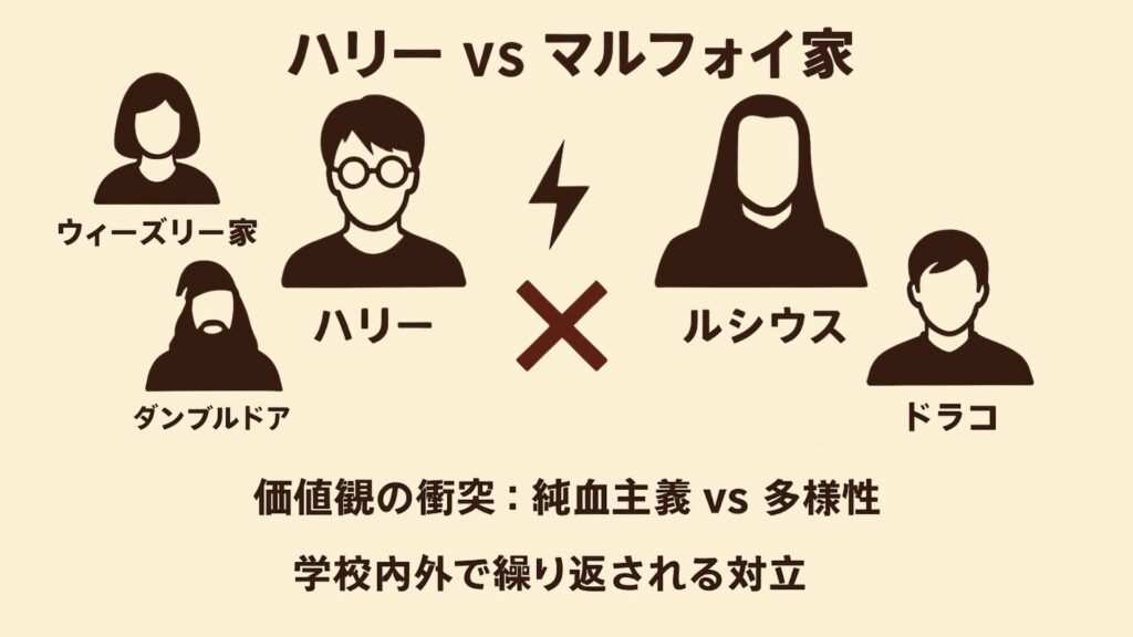 ルシウスはハリーと対立することが多く、マルフォイ家はダンブルドアやウィーズリー家としばしば衝突します