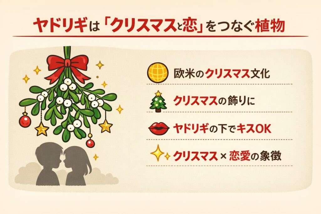そのため、ヤドリギは「クリスマス」と「恋愛」を結びつける存在として知られています