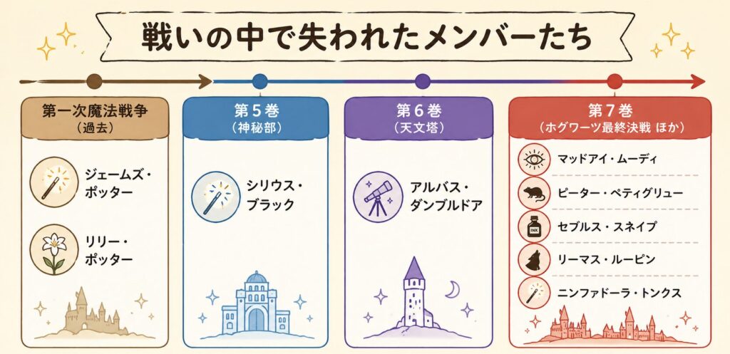 不死鳥の騎士団のメンバーは時代によって変化しますが、基本となるのは第5巻時点の再結成メンバーです