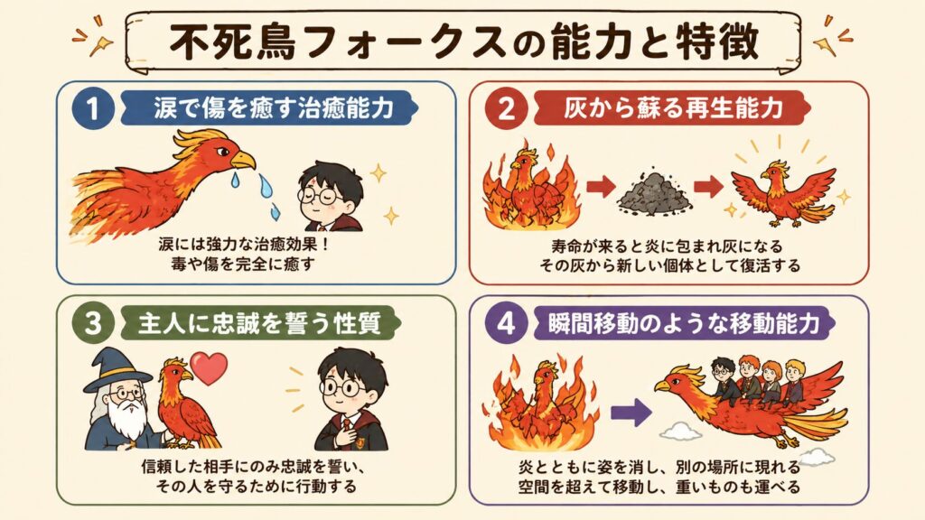 不死鳥は「再生・治癒・忠誠」を持つ特別な魔法生物で、フォークスは物語の重要な場面でハリーを救った存在です
