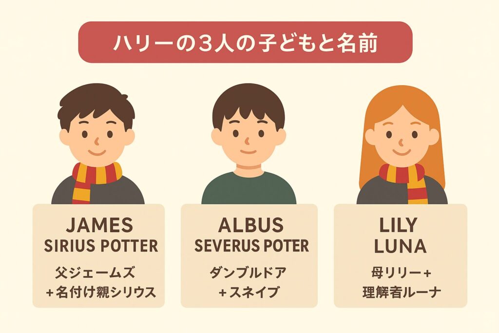 ハリーには子供が3人おり、それぞれハリー・ポッター作品で登場した人物の名前をつけています