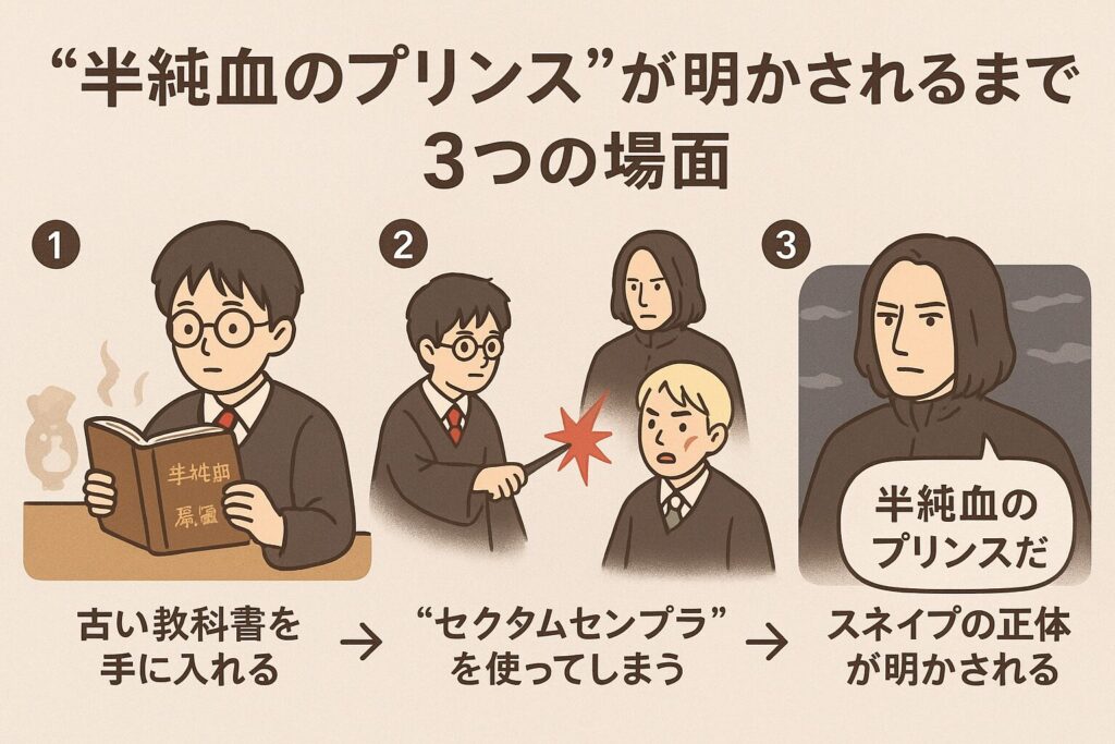 その中で、ハリーが再度「セクタムセンプラ」の呪文を使用した際に、スネイプ自身がその呪文の発案者であること、つまり「半純血のプリンス」だと正体を明かします
