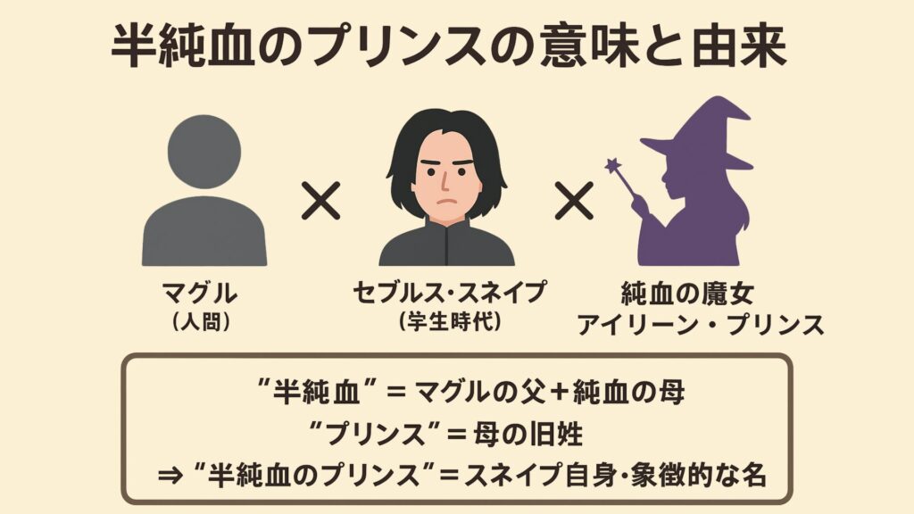 母の旧姓「プリンス」、そしてマグルと純血の魔女から生まれた「半純血」であることから彼が学生時代に自らを「半純血のプリンス」と呼んでいたことに由来します
