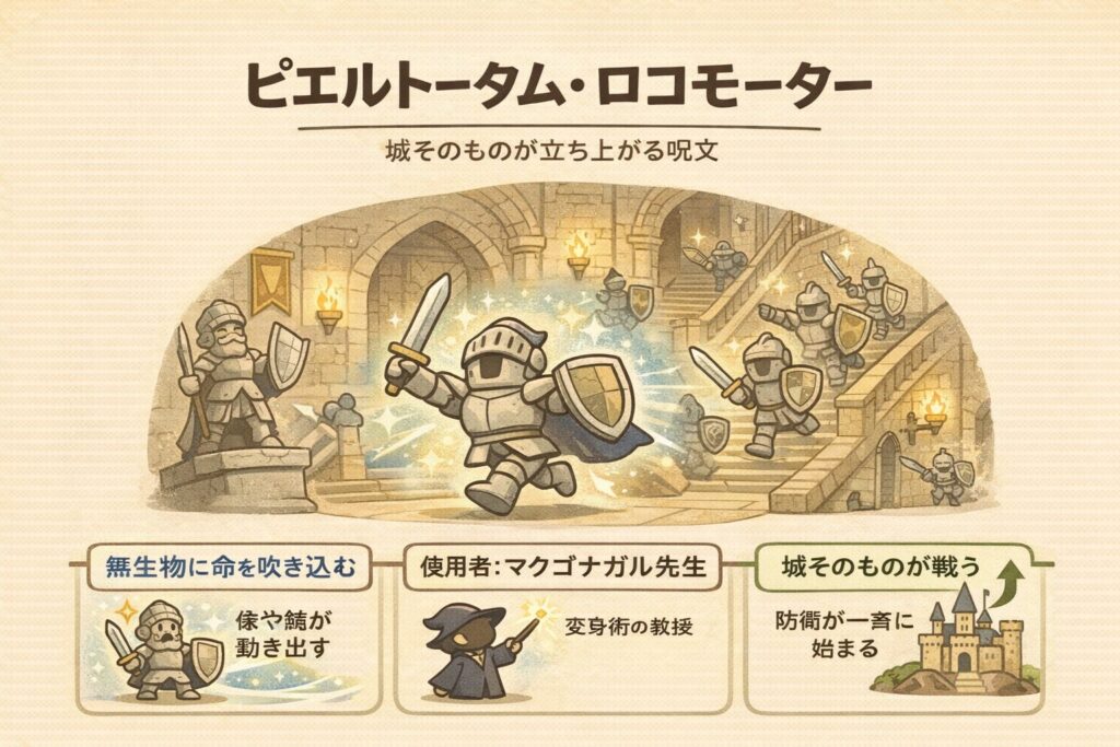 ピエルトータム・ロコモーターは、無生物に命を吹き込む魔法で像や鎧を動かすことができます