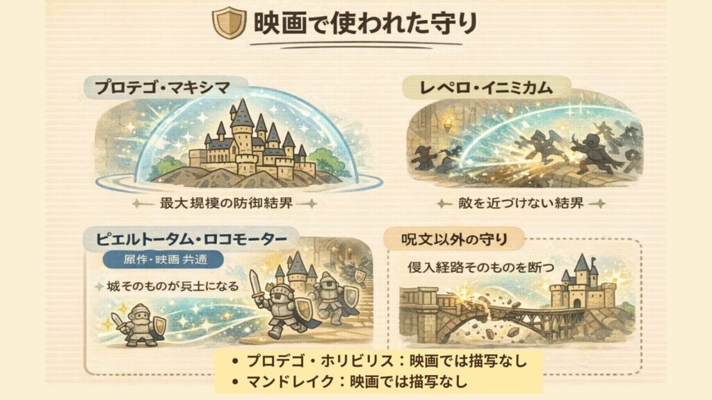 この2つの呪文をフリットウィック先生、ホラス・スラグホーン、モリー・ウィーズリーが唱えながら光のドームが城を包む演出が描かれました