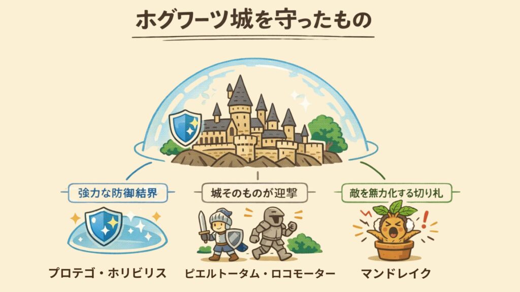 ホグワーツ城は、先生たちの防御呪文を組み合わせて守られており、原作と映画で異なる部分もあります