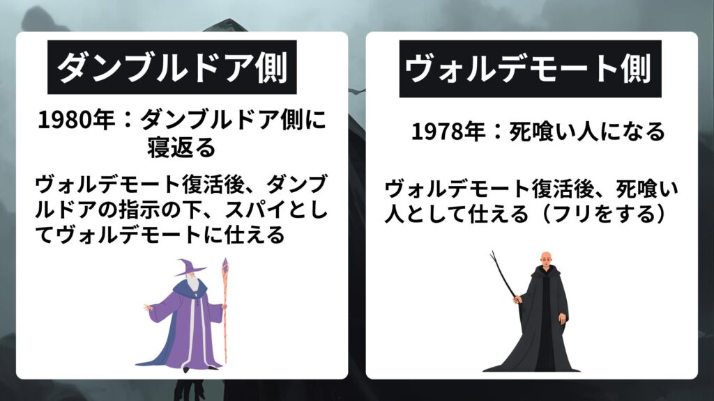 - 1980年~:ダンブルドア側に寝返りヴォルデモートに関するスパイ活動