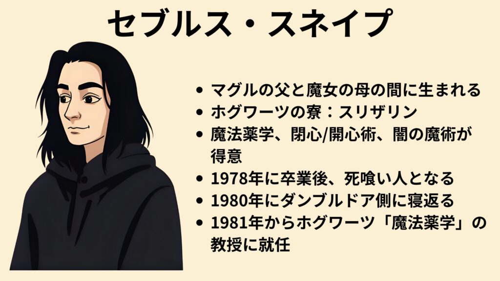 セブルス・スネイプは、ホグワーツ魔法魔術学校のスリザリン寮出身で、魔法薬学の教授として知られる人物です