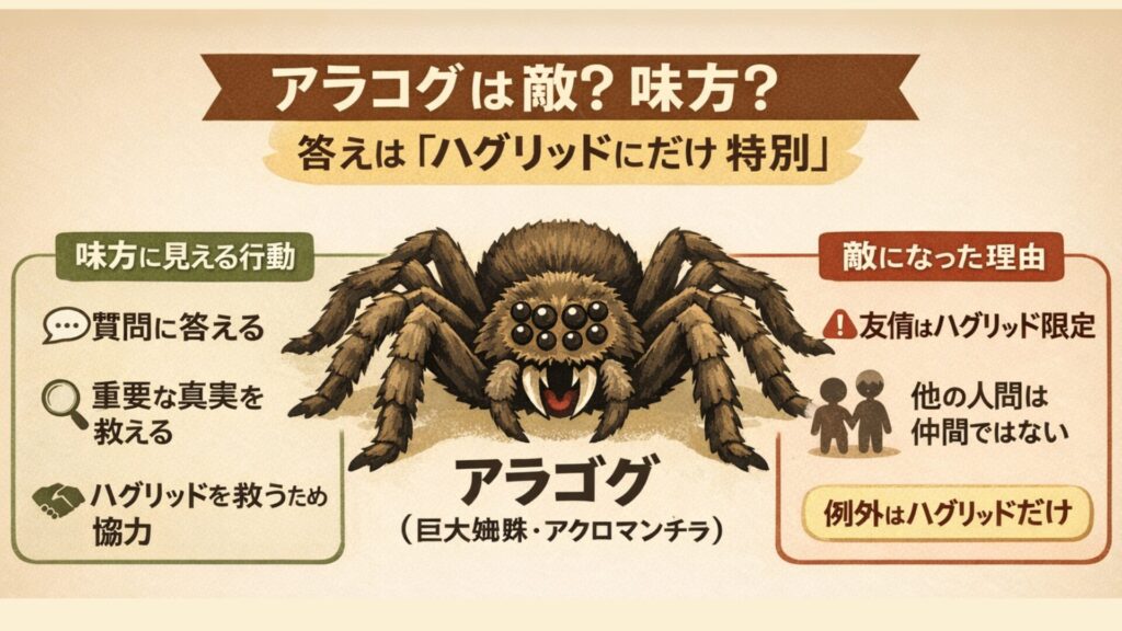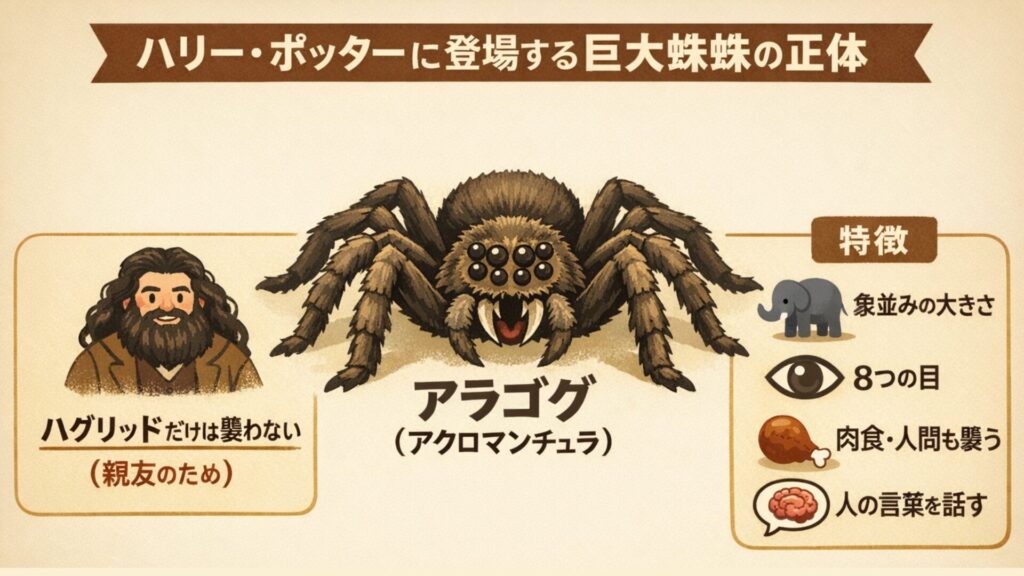 アラゴグは、禁じられた森に住む非常に大きな魔法生物の蜘蛛で、見た目は恐ろしいですが、物語の中では重要な役割を担っています