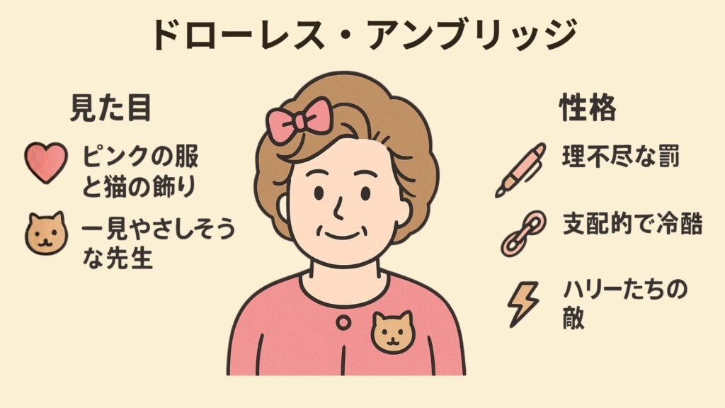 見た目はかわいらしいピンクの服や猫の飾りを身につけていますが、その性格は非常に残酷かつ支配的でハリーたちに理不尽な罰を与えるなど、ハリーたちの敵側の魔法使いです