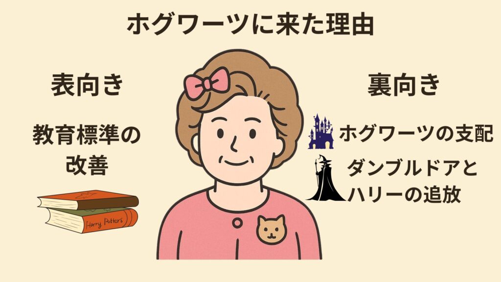 表向きの理由は「教育水準が低下したホグワーツを改善する目的」ですが、実際はホグワーツを支配下に置くためのスパイです