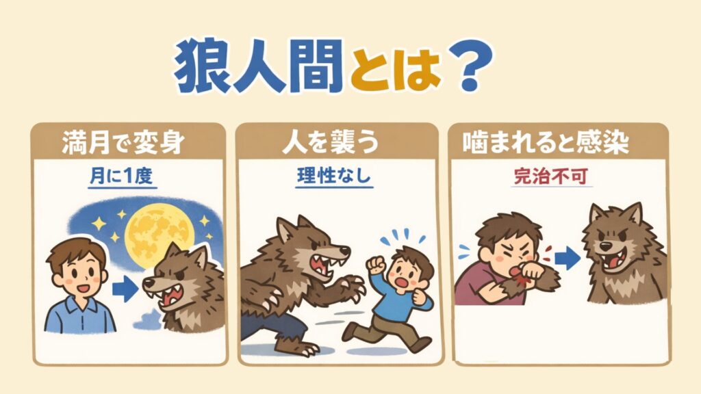 狼人間とは、満月の夜に狼へと変身してしまう呪いを持った人間のことです